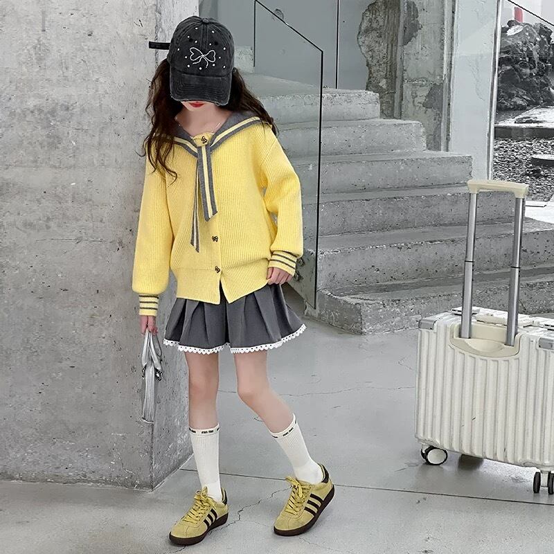 セーラー風カーデ&プリーツスカート(イエロー×グレー)