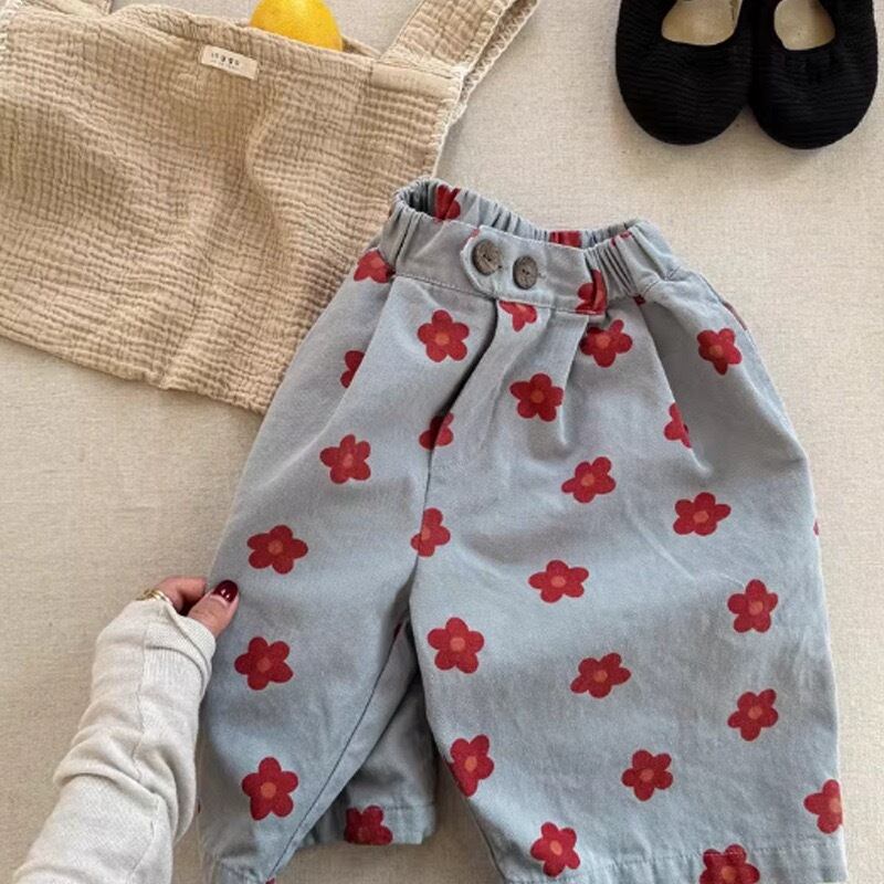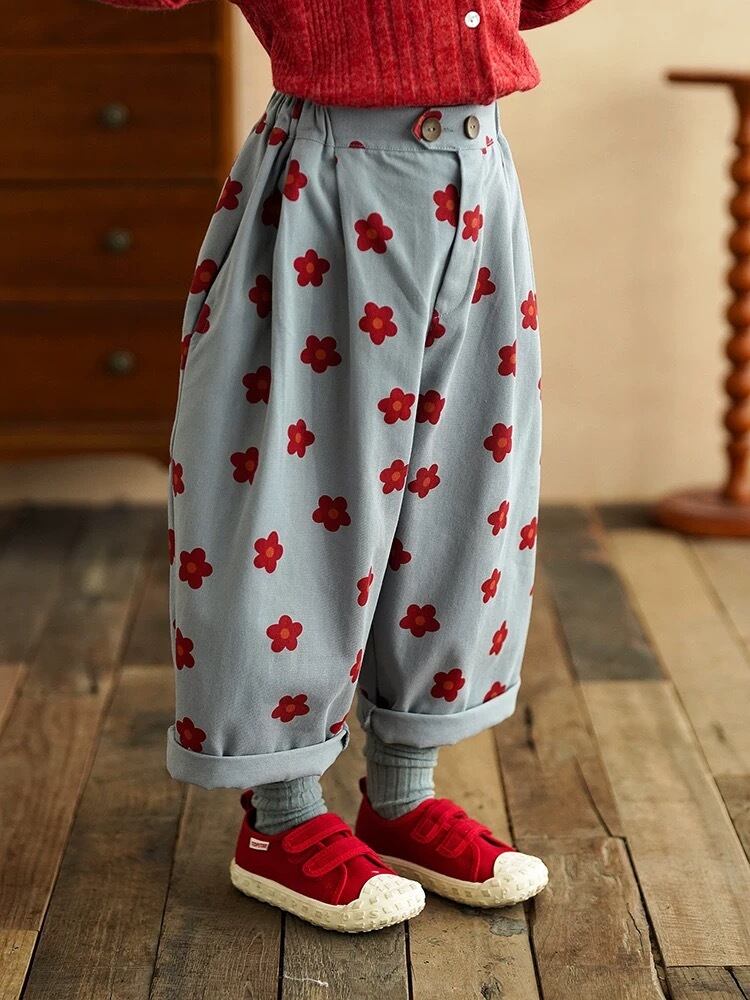 ころんとしたフラワープリントが映えるナチュラルパンツ。