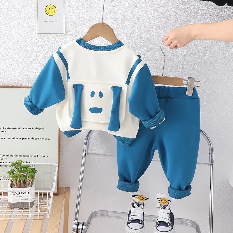 ワンちゃんの顔が胸に、あんよがズボンについています。また背中には大きなお顔が!