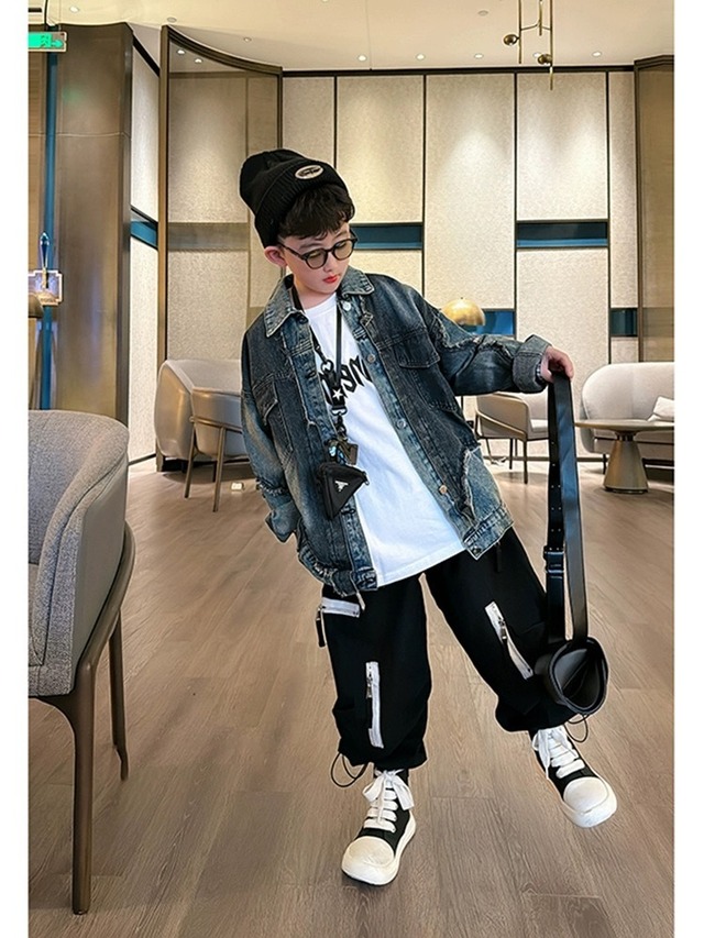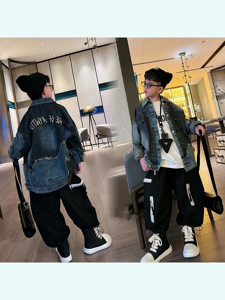 色の違うデニム生地が組み合わさったジャケット。背中の刺繍もおしゃれです!