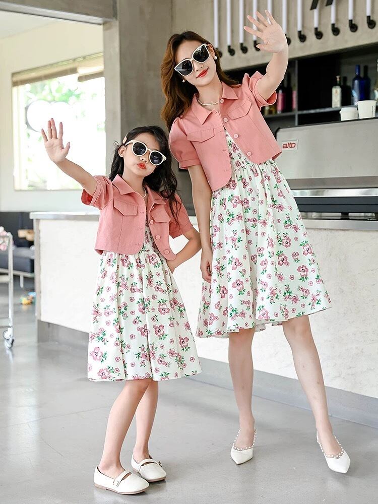 ママとお揃いのピンクジャケットと花柄ワンピースで、街中のお出かけがさらに特別な時間に!