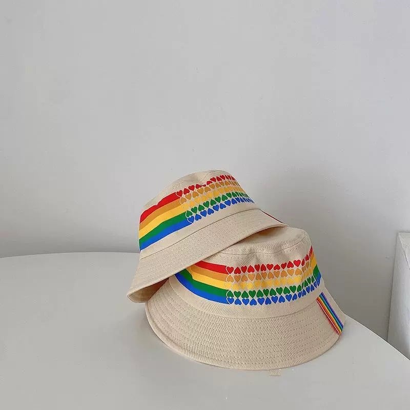 虹がかかったようなデザインの帽子。