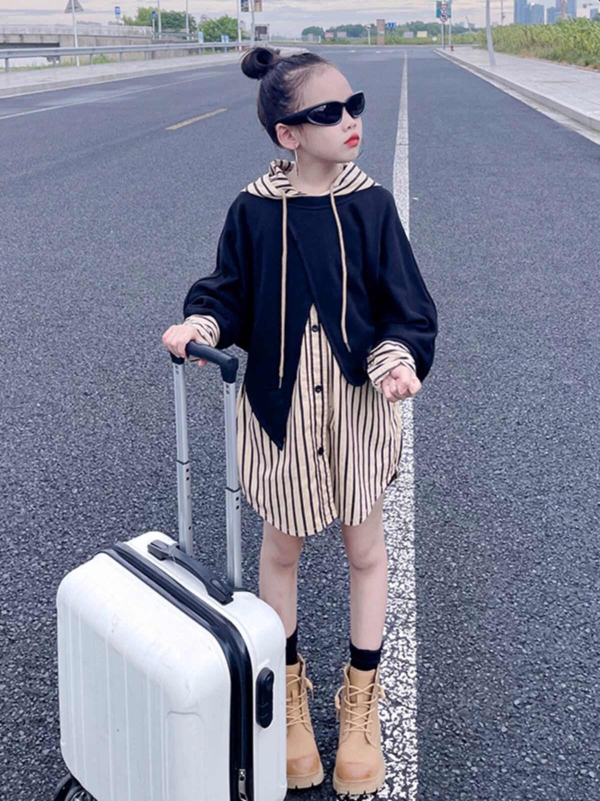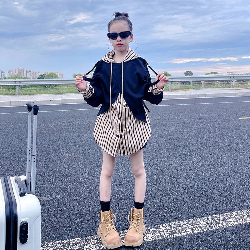 クールなストライプ柄のシャツワンピースと、シンプルなブラックフーディのセット!