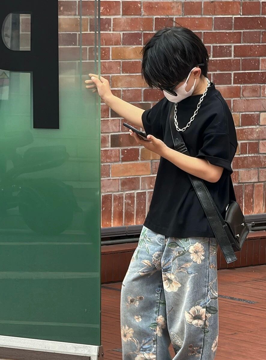 デニム調の生地に淡いトーンで描かれたフラワーモチーフが、スタイリッシュで落ち着いた印象を与えます。