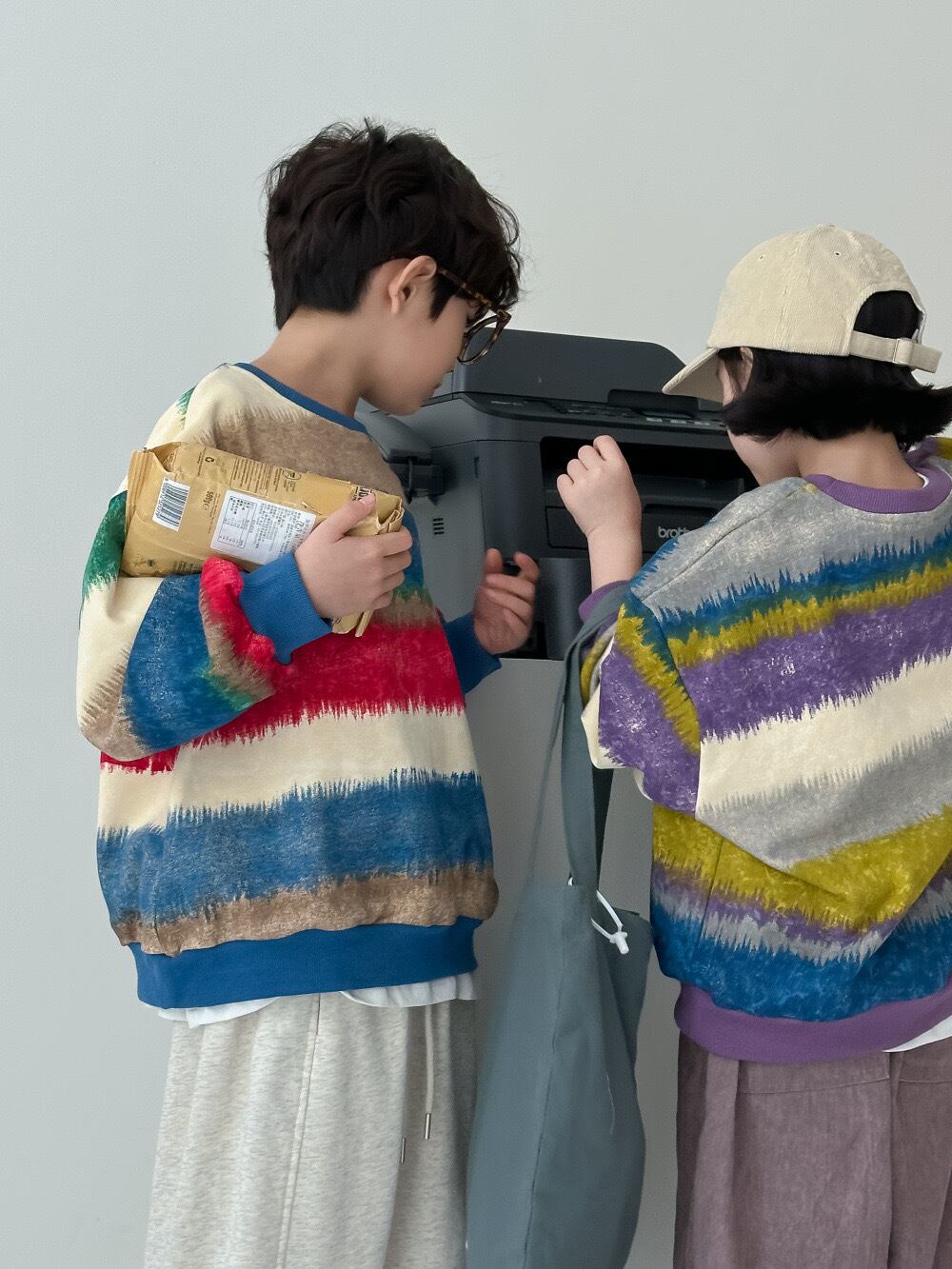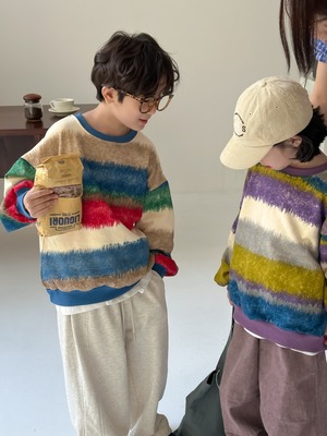 全体に施されたカラフルなブレンドカラーが個性を引き立て、シンプルながらも存在感のある一枚です。程よい厚みのある生地は、秋冬シーズンに最適で、どんなボトムスにも合わせやすい万能アイテム。兄弟や姉妹で色違いのコーディネートを楽しむこともできます。