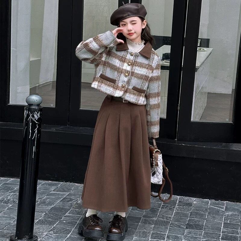 落ち着いたブラウンカラーのミモレ丈スカート。