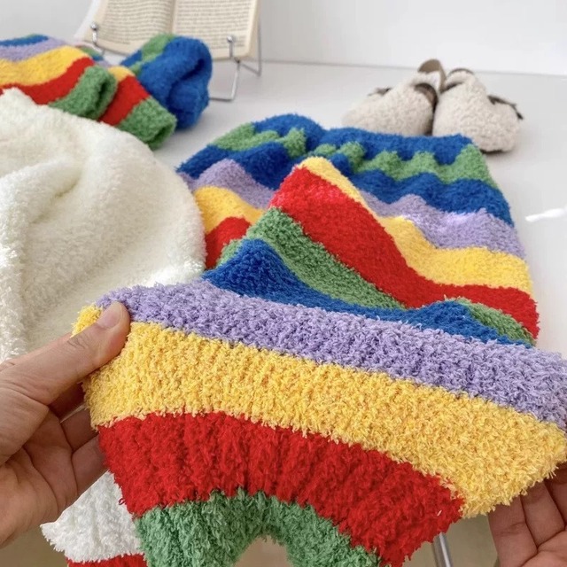 ふわふわな手触りとカラフルなデザインが魅力のルームウェアセットです。トップスにはニコちゃんマークと「APPLE」の刺繍が施され、遊び心たっぷりの可愛さ!ボトムスは虹色ボーダー柄で、お部屋の中でも気分がパッと明るくなります。暖かいモコモコ素材で、寒い季節のおうち時間にぴったり。お揃いコーデで仲良し感もアップ!お子様用ルームウェアとして、ギフトにもおすすめの一着です。
